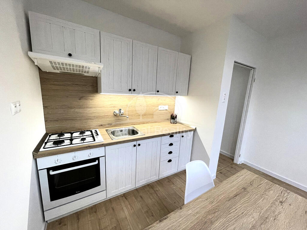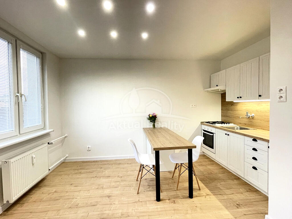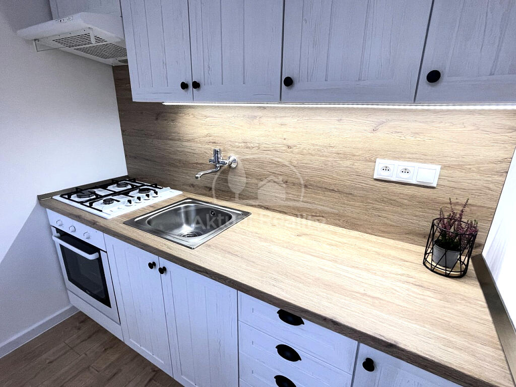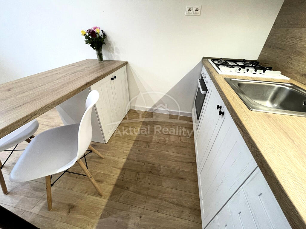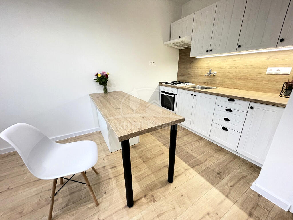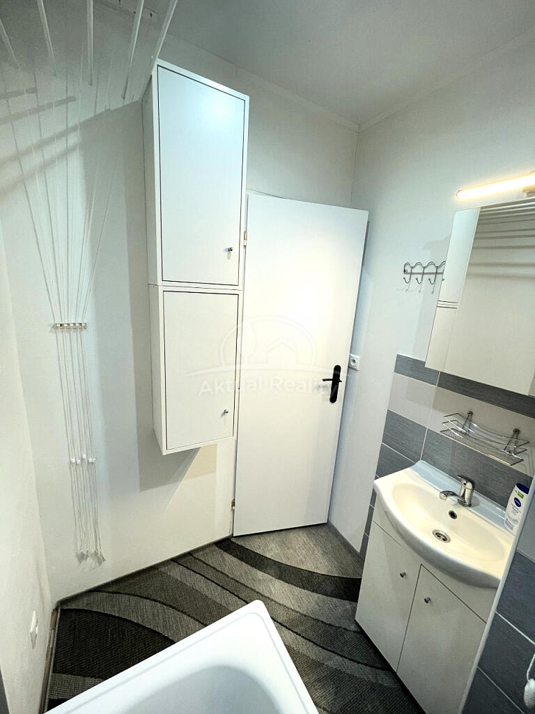 Byt je po kompletnej rekonštrukcii. Byt pozostáva z vstupnej chodby, kúpeľne s WC, kuchyne a izby. Bytové jadro je nové - murované s novou sanitou, keramické obklady, keramické dlažby, vaňa a závesné WC so systémom Geberit. Kúpeľňa je priestranná s priestorom na pračku. V byte je nová elektroinštalácia a ističe + prúdová ochrana, nové odpady a nové rozvody vody. Na podlahách v celom byte sú nové plávajúce podlahy, v bytovom jadre je keramická dlažba. Kuchynská linka je tiež nová so vstavanými spotrebičmi a ostrovčekom + digestor s odsavaním do ventilačnej šachty. V kuchyni je špajza. Okná v byte sú plastové - Slovaktual. Na kuchynskom okne je vešiak na sušenie prádla. Byt je novo vystierkovaný a vymaľovaný. Stropy sú znížené sadrokartónom s bodovým osvetlením. K bytu patrí tiež pivnica. Okolie poskytuje plnú občiansku vybavenosť.